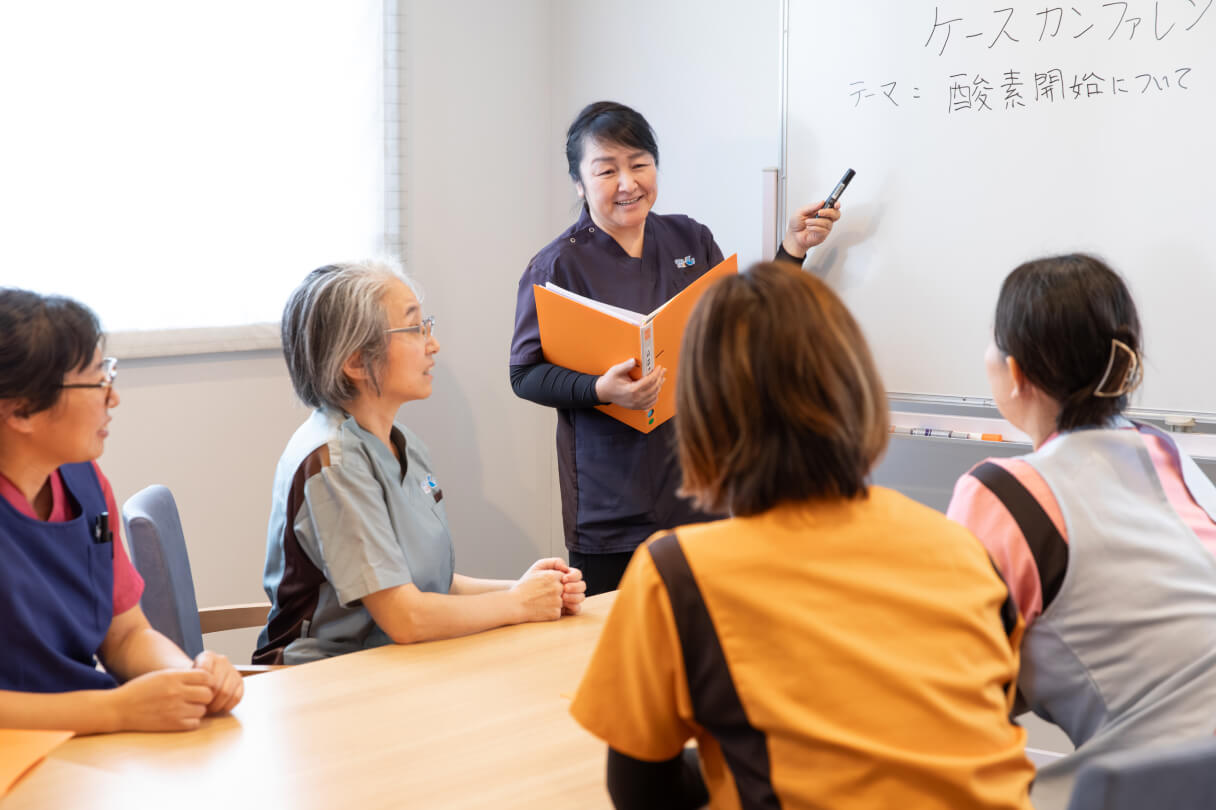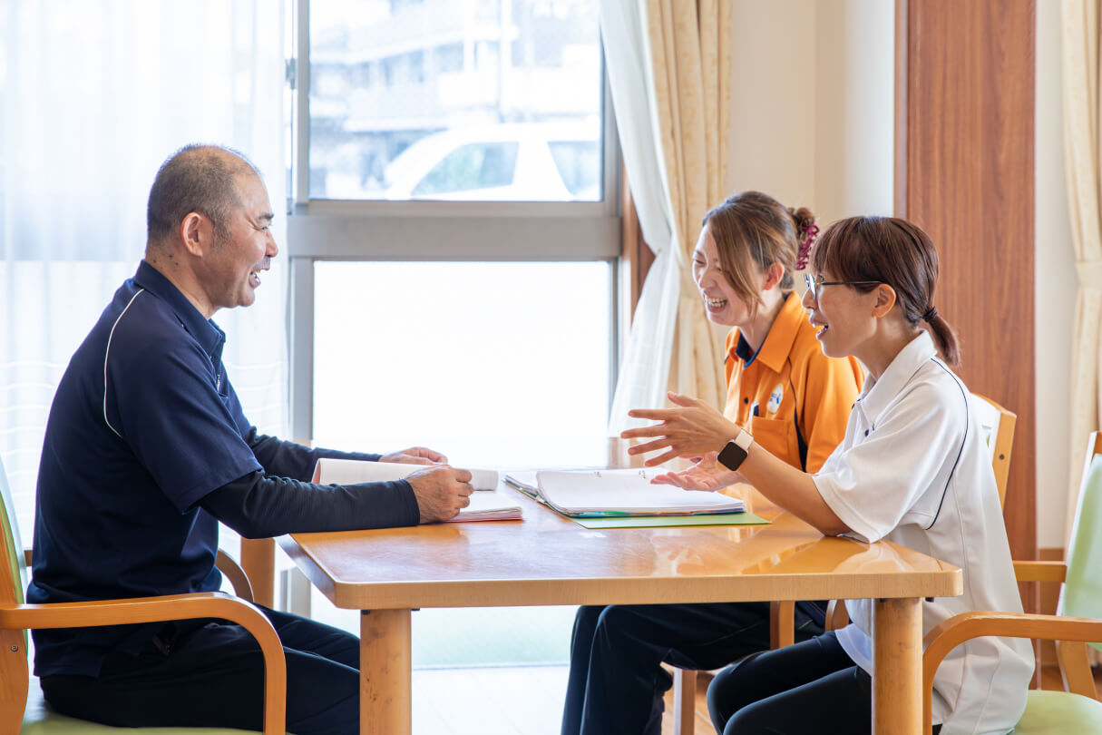 介護・看護・リハビリ・調理・事務などさまざまな職種が一つのチームとして動き、小さな変化も共有しています。